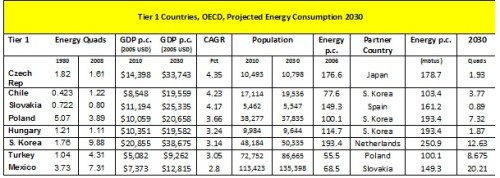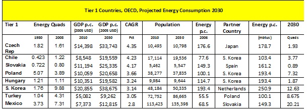 For this tier of countries I used the same methodology as I did when studying the developing world. I looked at their projected GDP per person for 2030. I then found a country (that did not look radically dissimilar in other ways) that had the same GDP per capita in 2008. I hijacked the partner country’s energy consumption per capita and multiplied it by the target country’s projected population for 2030 and voila: