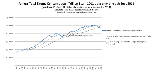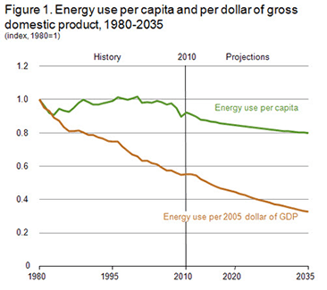 However… I did notice… “Overall U.S. energy consumption grows at an average annual rate of 0.3 percent from 2010 through 2035 in the AEO2012 Reference case.” And… “Energy consumption per capita declines by an average of 0.6 percent per year from 2010 to 2035.” And…”Energy consumption per capita declines by an average of 0.6 percent per year from 2010 to 2035 (Figure 1). The energy intensity of the U.S. economy, measured as primary energy use in British thermal units (Btu) per dollar of gross domestic product (GDP) in 2005 dollars, declines by an average of 2.1 percent per year from 2010 to 2035.”