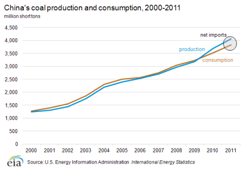 Or despair? “In 2011, China consumed an estimated 4 billion short tons of coal, representing about half of the world total. Coal consumption is about 3 times higher than it was in 2000, reversing the decline seen from 1996 to 2000.”